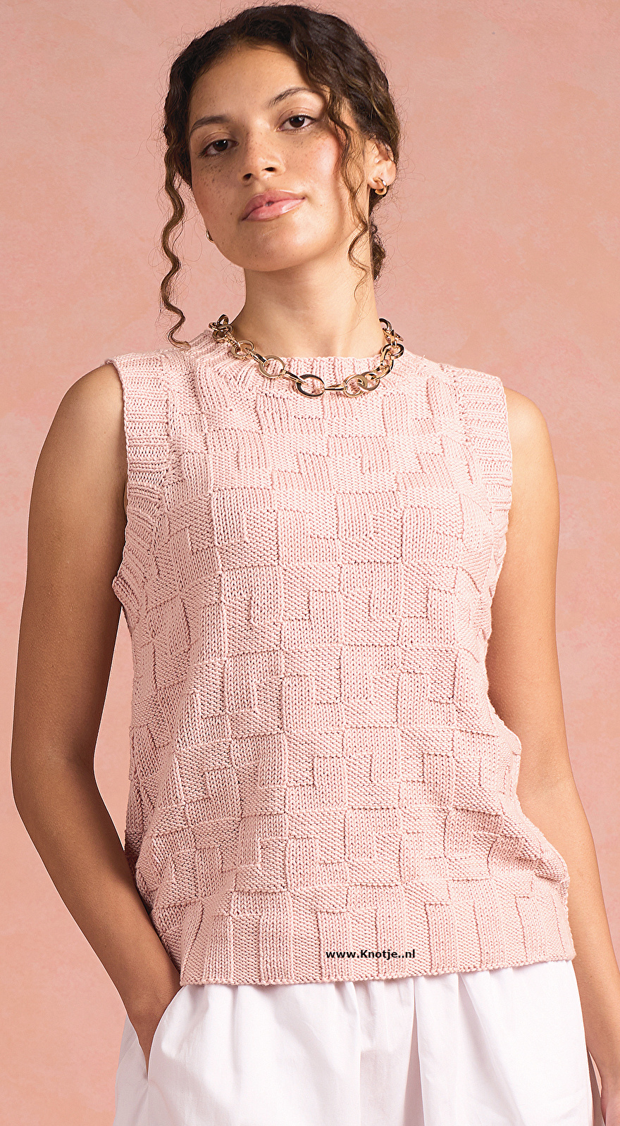 "Deze trui van Georgia Farrell heeft een klassiek silhouet en is perfect om te combineren met andere kledingstukken of om zo te dragen. Het patroon, dat doet denken aan ruitjespapier, is volledig ontstaan door het samenspel van rechte en averechte steken. Elk vierkantje is subtiel verhoogd of verlaagd, afhankelijk van of het een recht of averecht blokje is. Het patroon herhaalt zich gelijkmatig over het hele topje, waardoor de tanktop een geometrische, gestructureerde uitstraling krijgt."